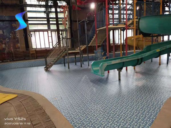 本項目位于北京市,為室內(nèi)水上樂園項目,原基礎(chǔ)為馬賽克瓷磚,局部有脫落、開裂問題,采用1.5mm泳池膠膜施工安裝,采用滿刮膠工藝熱熔焊接。施工安裝之前瓷磚損壞部分做找平處理,泳池膠膜施工安裝完畢后,整體比較平整、美觀?,F(xiàn)場效果如下: